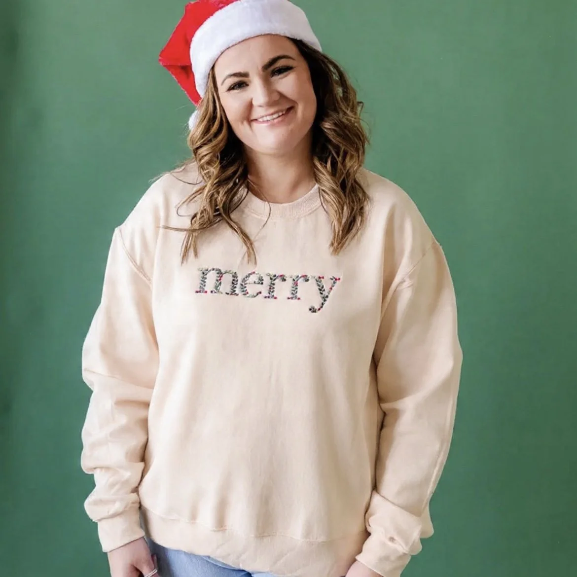 Super basic + perfect for everyday wear. Unisex fit, true to size, and your new go-to outfit for the comfy cozy months ahead. Beautifully embroidered “merry” design on a soft sand/cream colored crewneck.