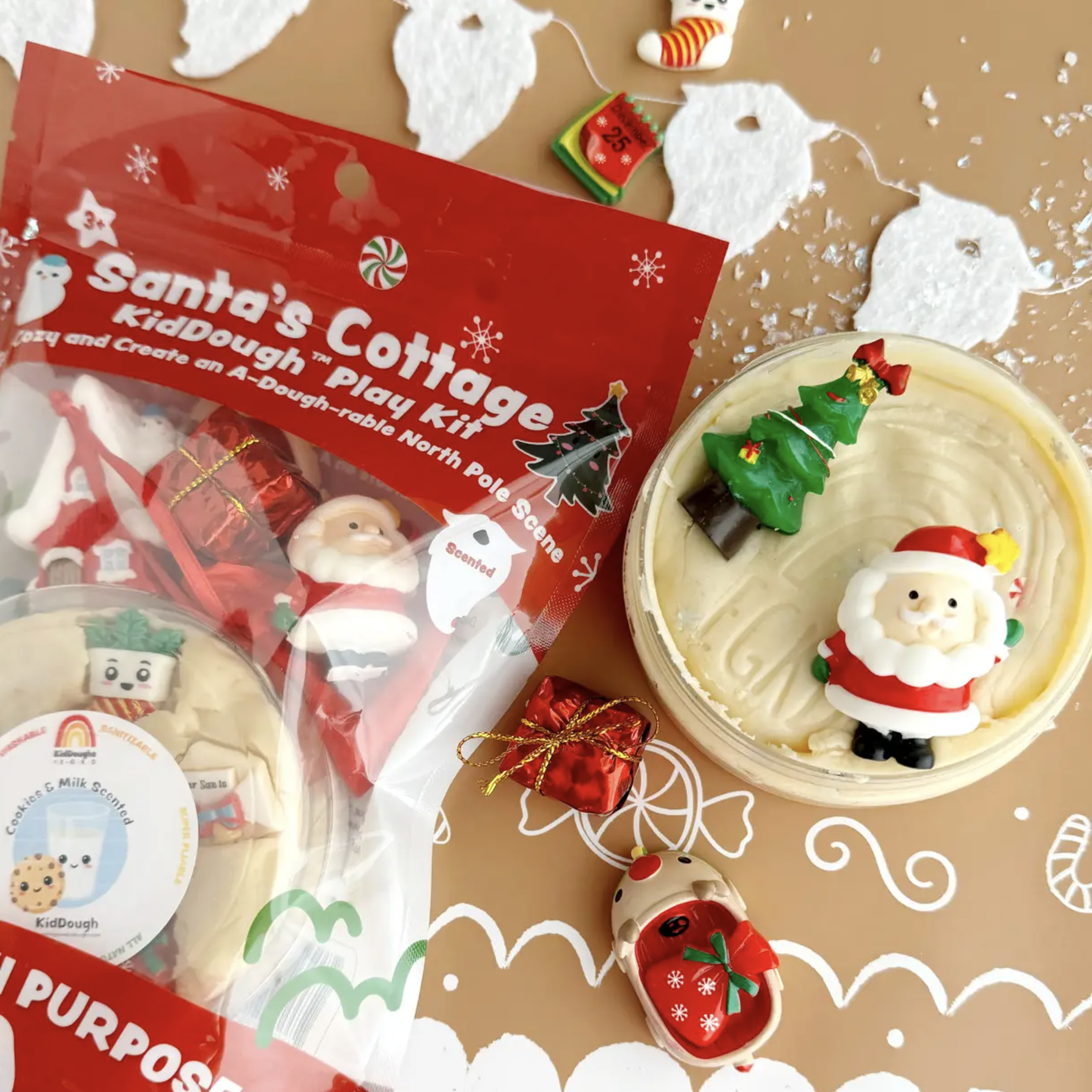 Includes: 8 oz White (Milk & Cookies) KidDough with Cozy North Pole Charms Inside, Santa, Santa's Cottage and Christmas Tree Figurine, Reindeer Go Kart for Santa to Zoom Around the North Pole, Santa's Bag, Present, Jar with Faux Snow and Jar with Swirly Peppermints and Snowflakes
