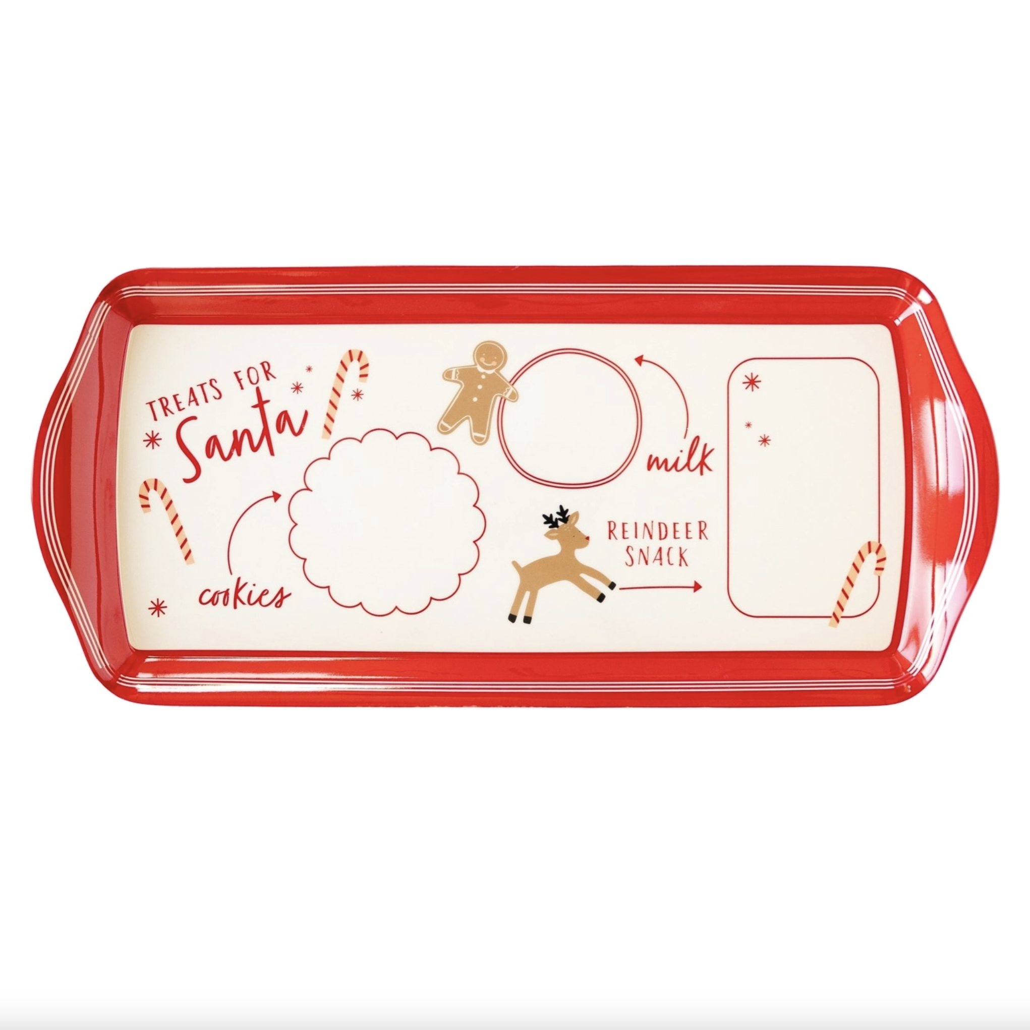 Start a fun holiday tradition of leaving your favorite Christmas treats for Santa with your loved ones with this Santa cookie tray. This whimsical features a festive design with a place to put Santa's cookies and milk and a space to leave snacks for his reindeer. Your little ones will delight in leaving their favorite holiday goodies to share with Santa and his reindeer.