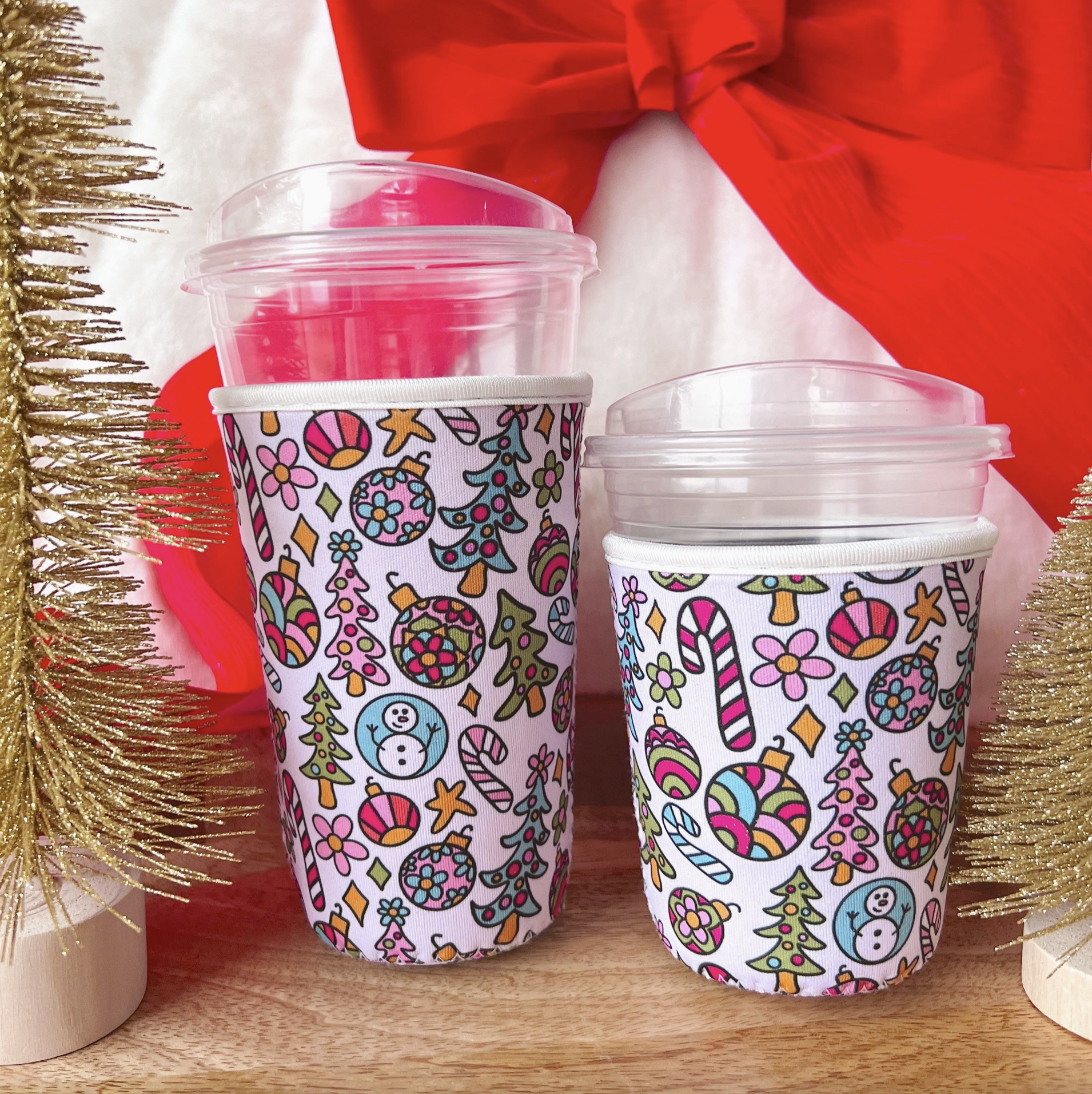 Adorable holiday / Christmas inspired design featuring funky Christmas trees, stars, ornaments, candy canes, snowman and the funnest groovy colorways. Iced Coffee Cup Covers make the perfect stocking stuffer and teacher/daycare provider gifts!