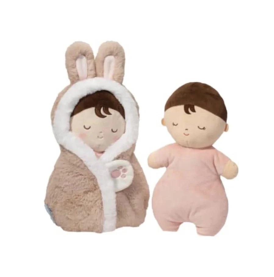 Treat your little one to a cuddle bunny like no other with our Baby Bunny Hug! Brimming with whimsy and charm, this interactive soft toy will capture the imagination and inspire hours of play. Wrap the Baby doll within the cozy swaddle when its time to nap. The closure is designed for easy use and has been detailed with a pink, embroidered paw print. A pair of rabbit ears accent the swaddle’s plush trimmed hood, while a fluffy, white tail accents the back. With its variety of soothing textures and baby safe embroidered features, this soft toy is as suited to nap time as it is to play time. Bring home our Baby Bunny Hug for the very best in woodsy snuggles!